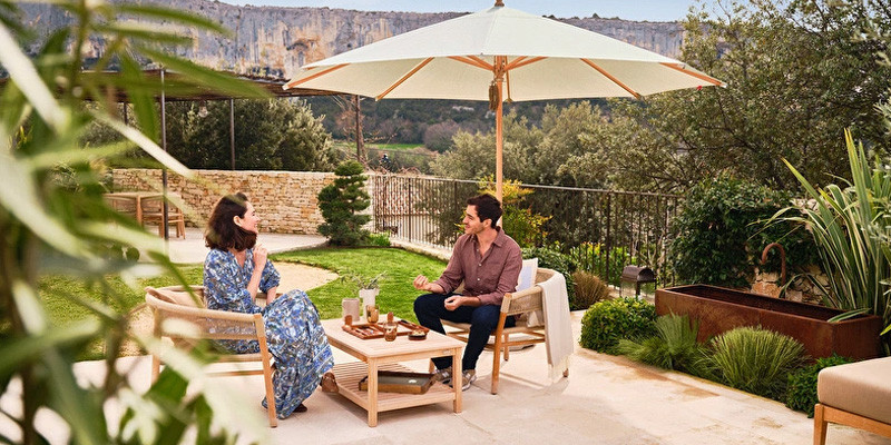 One umbrella shades two areas at once, keeping outdoor layouts clean, efficient, and guest-friendly.
